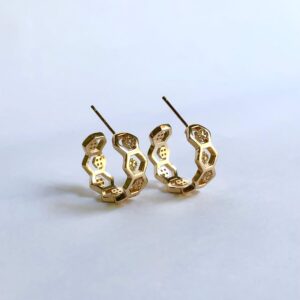 Avaliação 0 de 5R$98,00argola trabalhada em hexágonos maiores vazados e com outro mini hexágono cravejado dentro, folheada a ouro 18k e hipoalergênica.