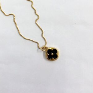 Avaliação 0 de 5R$49,00colar de corrente veneziana folheada a ouro com pingente medalha em metal com banho de verniz italiano e estampa de trevo esmaltado em preto.