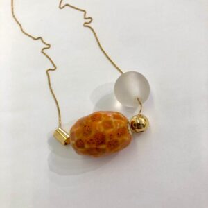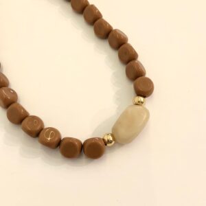 colar em contas triangulares abauladas em tons de caramelo escuro, no centro conta marmorizada bege com branco e esfera dourada em metal envernizado.