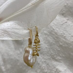 brinco de argola retangular folheada à ouro com pingente de pérola barroca em abs.