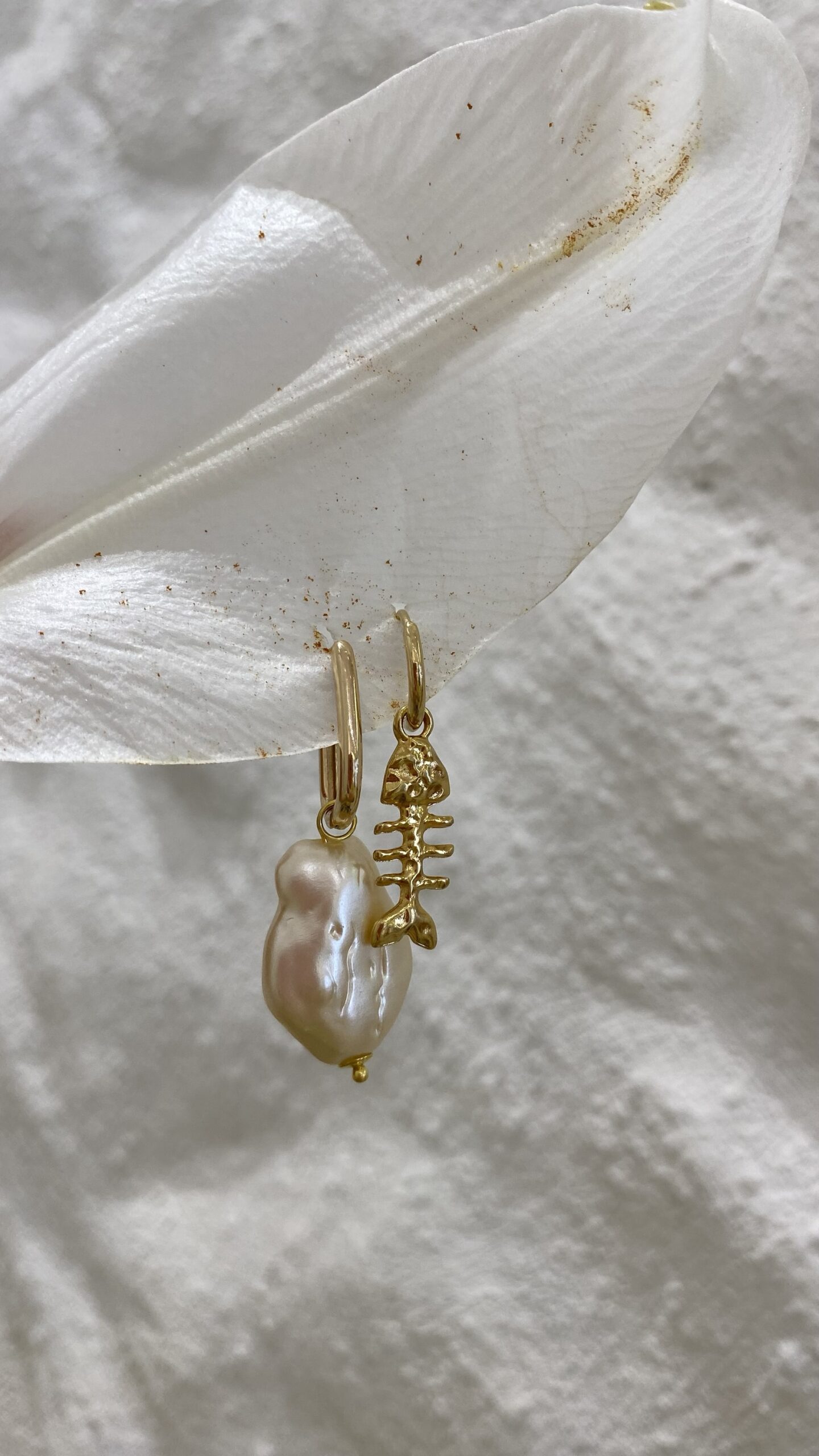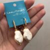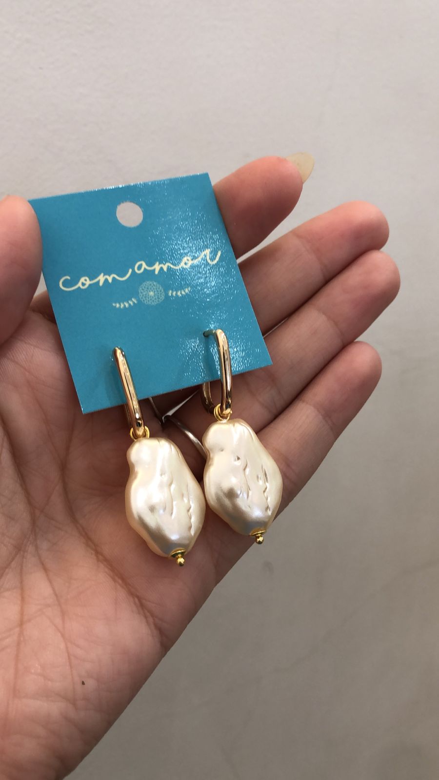brinco de argola retangular folheada à ouro com pingente de pérola barroca em abs.