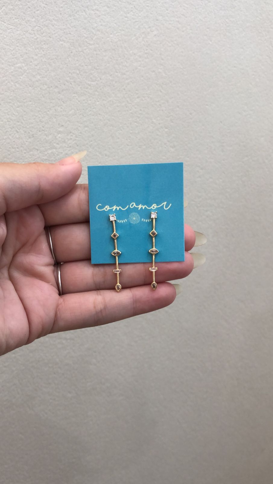 brinco com fio vertical trabalhado em zircônias de formatos diferentes (redondo, losango, oval, retângulo é gota) folheado a ouro 18k e hipoalergênico.