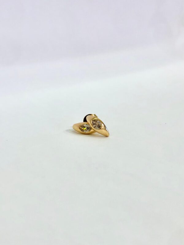 brinco folheado à ouro em formato de losango abaulado com zircônia em gota cravada.