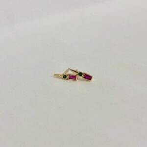 brinco folheado à ouro com duas zirconias coloridas, uma magenta retangular e uma verde redonda.