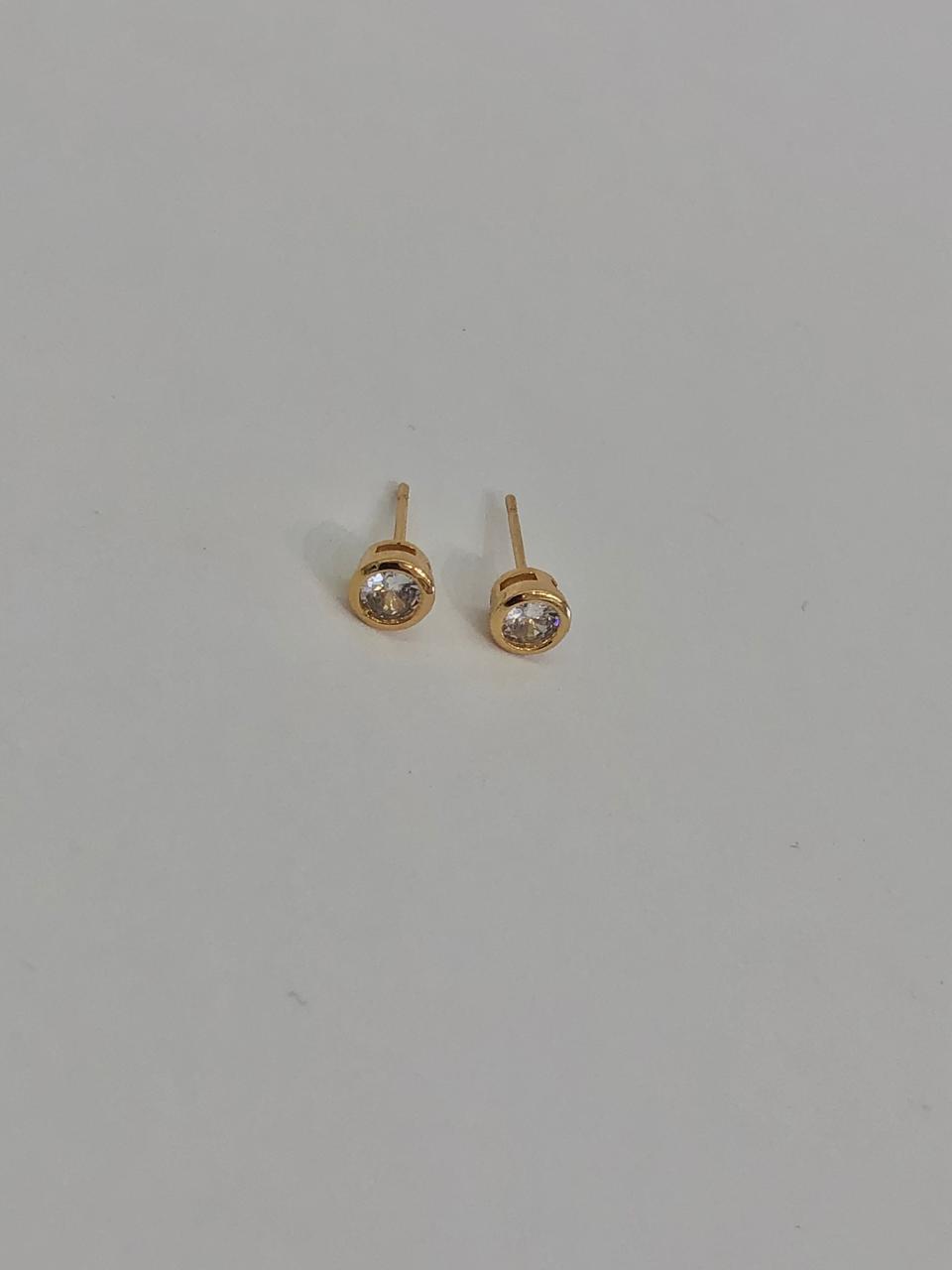 brinco folheado à ouro com zircônia redonda com acabamento dourado nas extremidades.