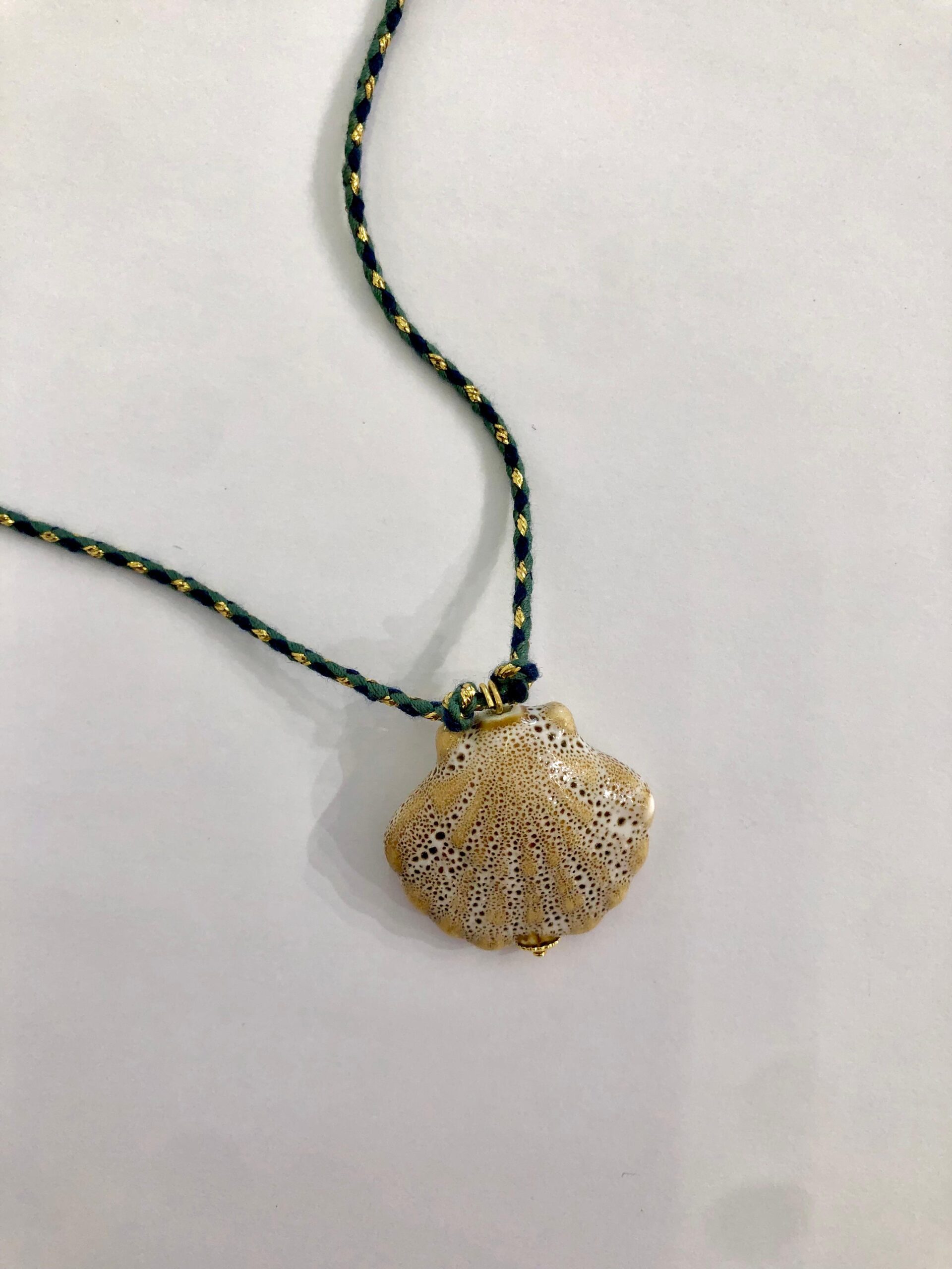 pingente de concha em murano medindo 3cm de cumprimento e 2,5cm de largura.