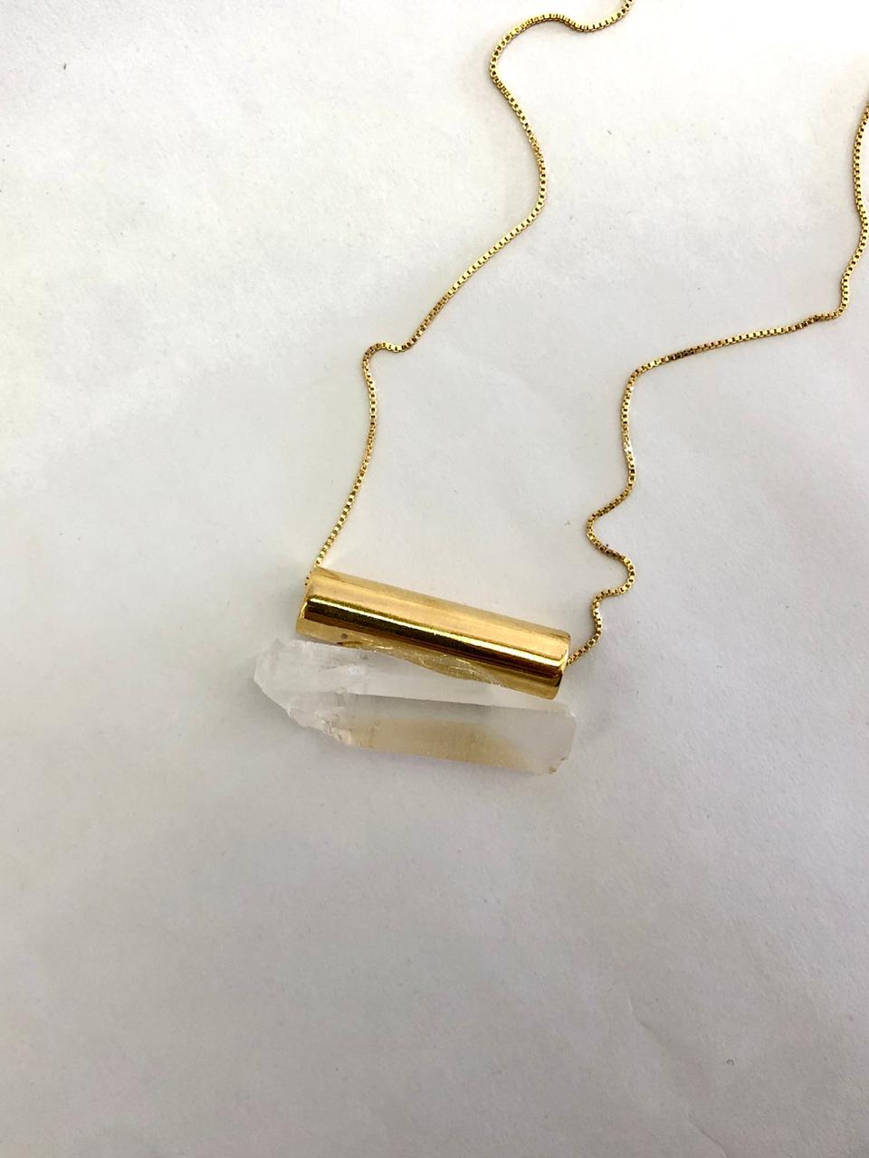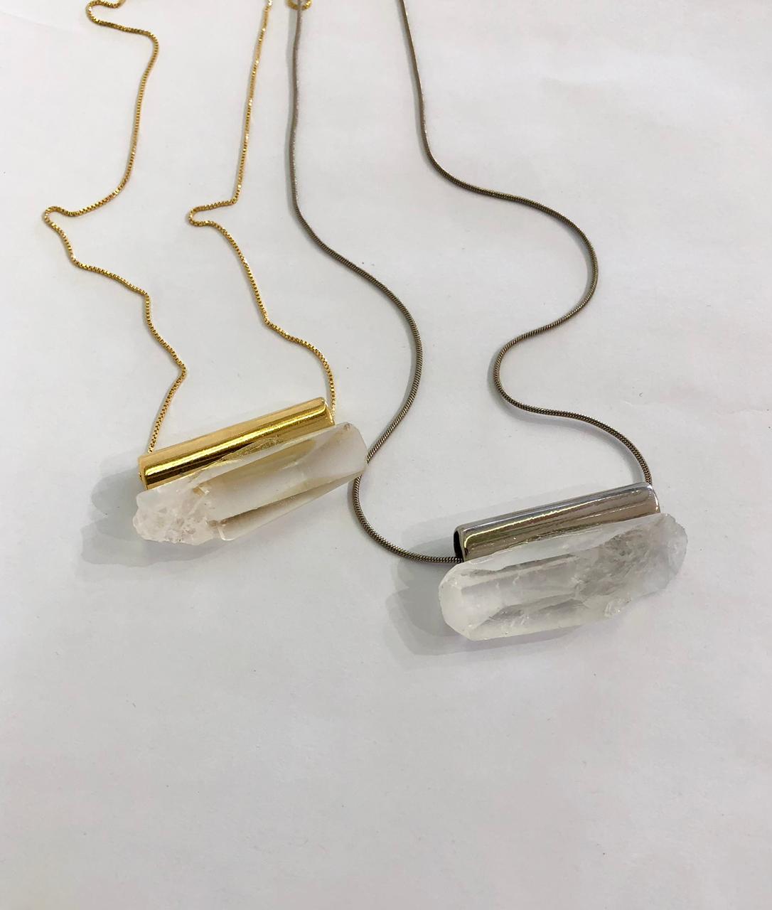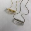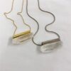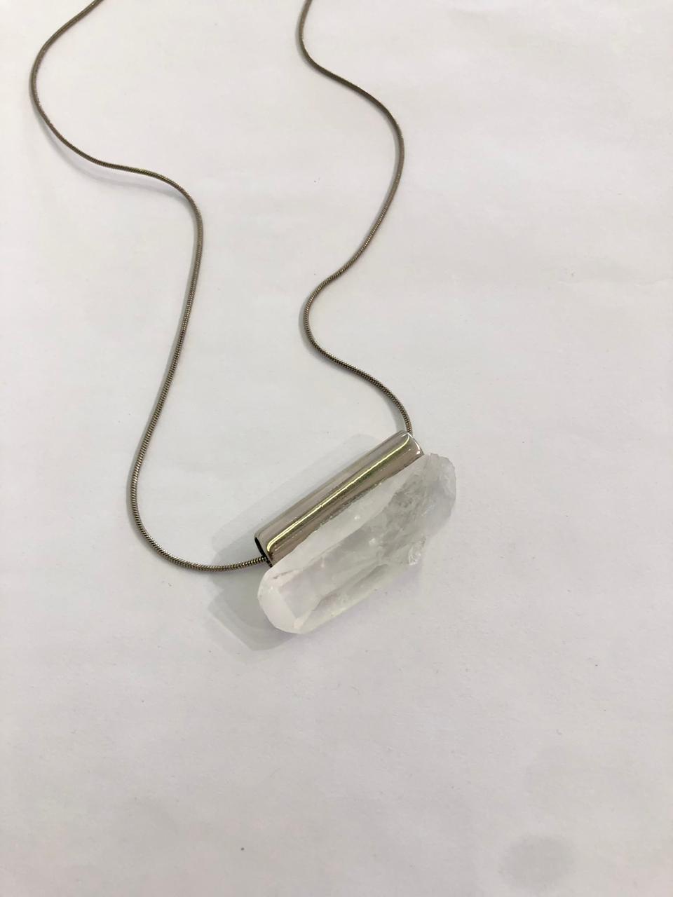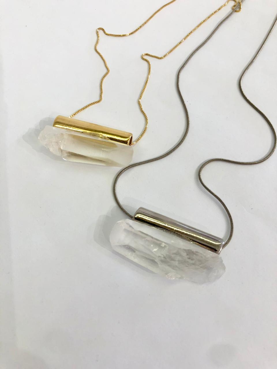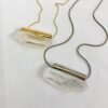 colar de corrente rabo de rato redondo em metal envernizado com pingente de pedra natural – quartzo transparente.