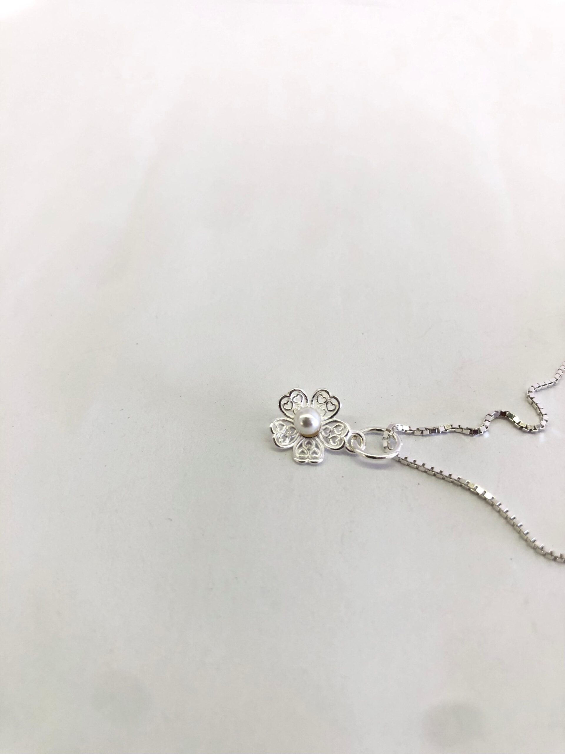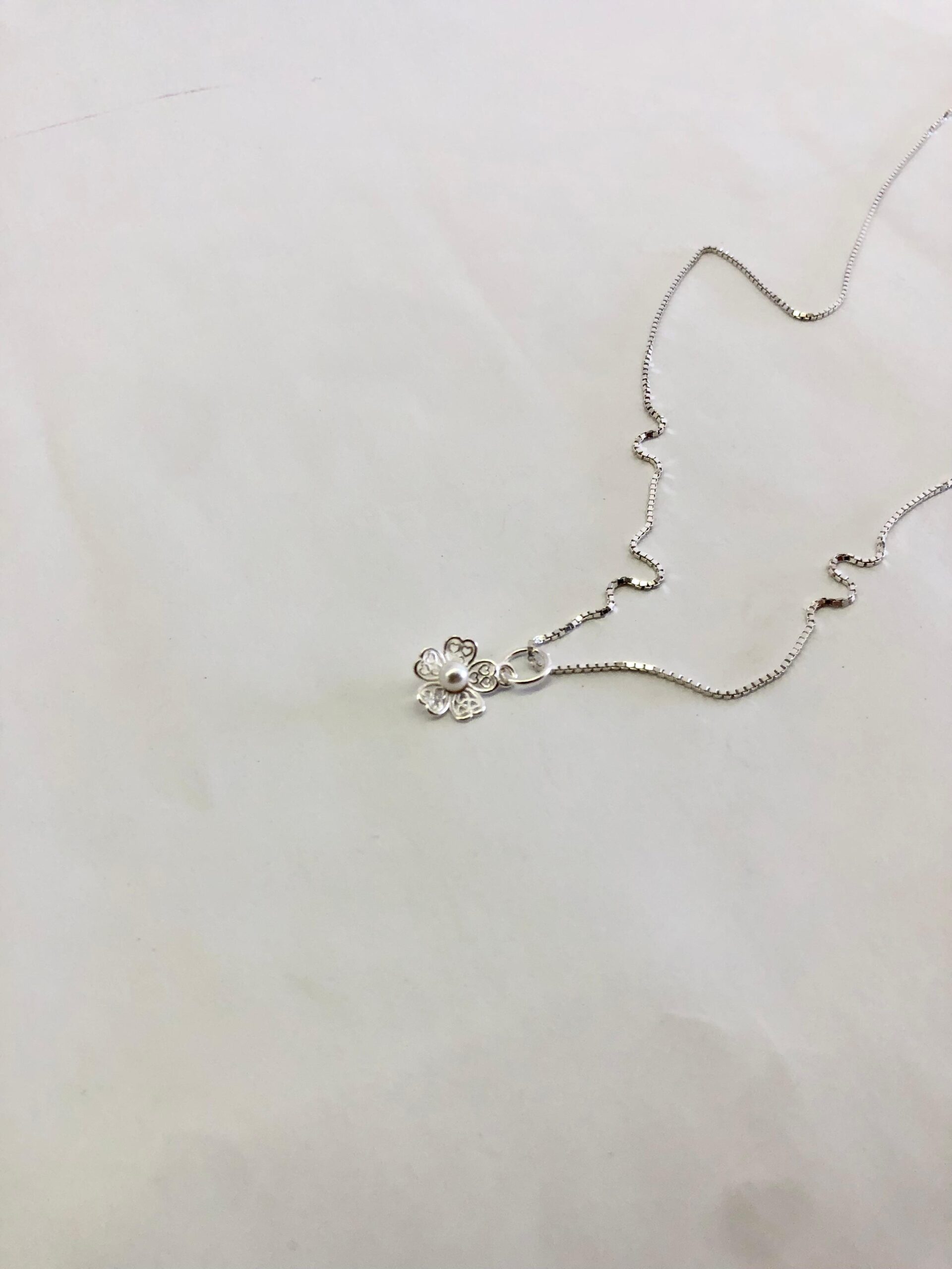 colar prata 925 com corrente veneziana e pingente de margarida trabalhada (pétalas vazadas em formato de coração, miolo de pérola).