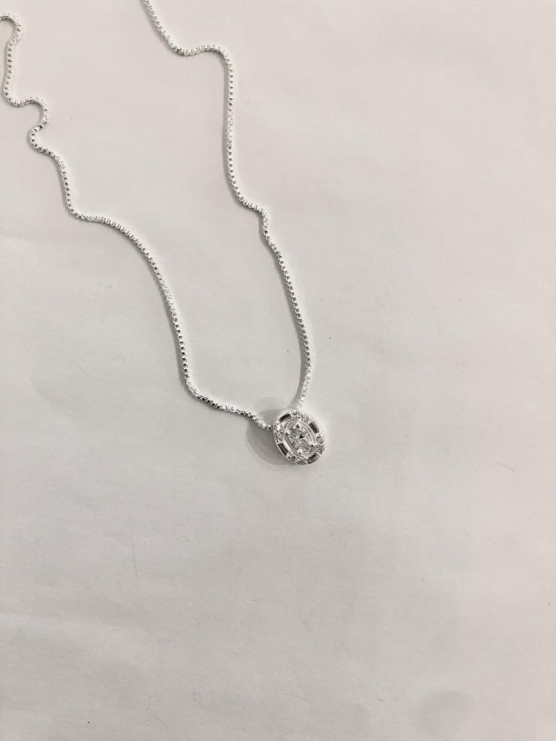 colar prata 925 com corrente veneziana e pingente de ponto de luz oval envolto de pedras.