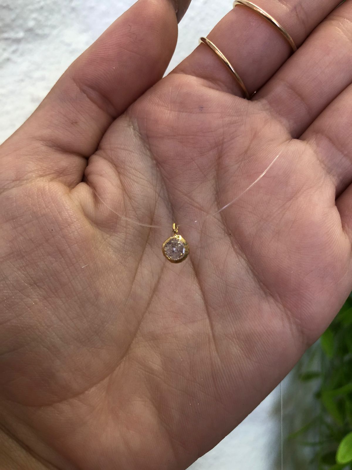 colar medindo 40cm, pingente de ponto de luz medindo 5mm de diâmetro.
