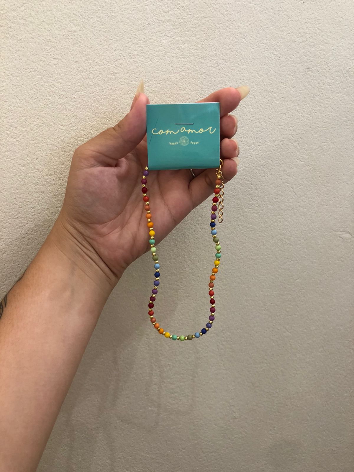 colar em contas coloridas e entremeios folheados à ouro, cabamentos, elos e fecho em metal envernizado.
