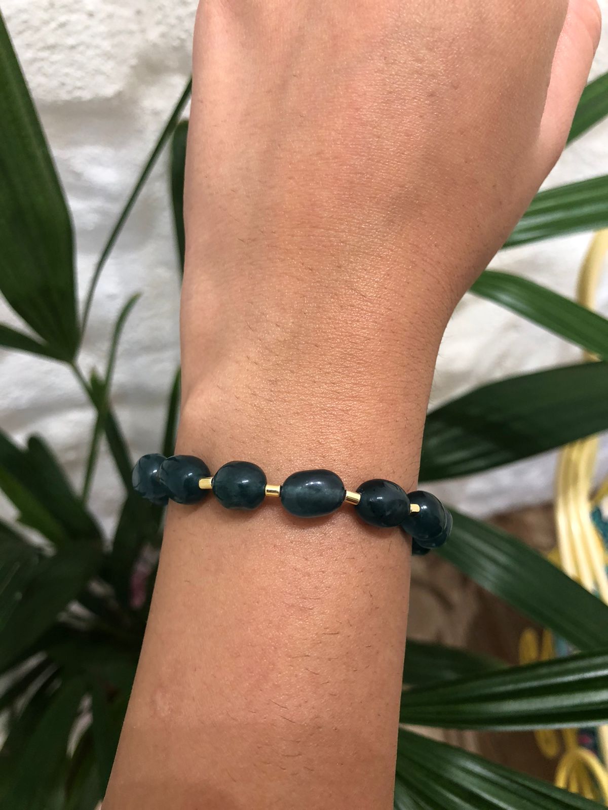 pulseira feito à mão com pedras ágatha verde e detalhes em folheado à ouro ,acabamento em metal envernizado com verniz italiano.