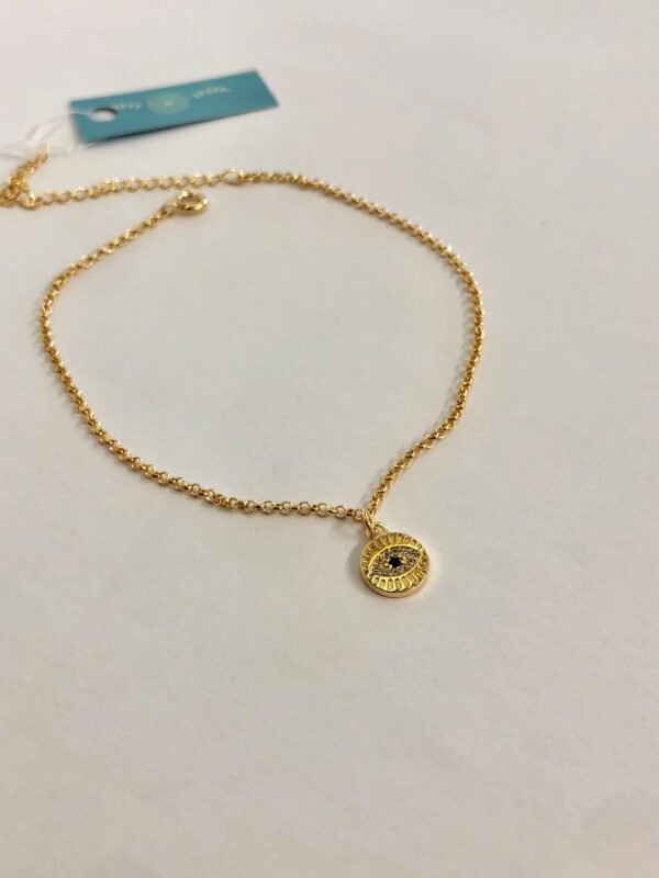 tornozeleira folheada à ouro, com medalha de olho grego cravejado.